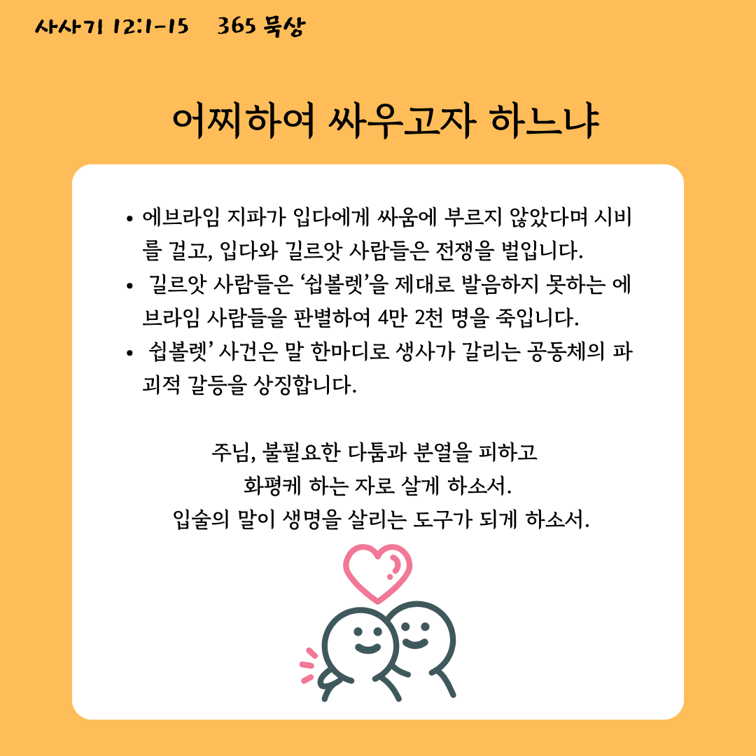 에브라임 사람들이 입다를 비롯한 길르앗 사람들의 정체성을 흔들며 자극하기 시작합니다. 길르앗 사람은 에브라임에서 도망친 무리가 아니라 본래 므낫세 지파의 한 분파인 마길의 아들 길르앗의 후손이었습니다. 그런데 길르앗을 향해 에브라임 사람들은 모욕적인 언사로 자극을 했습니다. 이에 길르앗과 입다는 참을 수 없어 군사를 소집하여 에브라임을 치게 되는데, 이 일로 4만 2천 명이 죽게 됩니다.