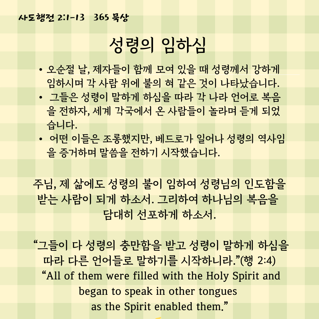 오순절 날 마가의 다락방에 임하신 성령님은 지금도 우리 가운데 거하십니다. 성령께서 오셔서 하시는 일은 진리의 말씀을 깨닫게 하고, 우리를 화평 가운데로 인도하십니다.