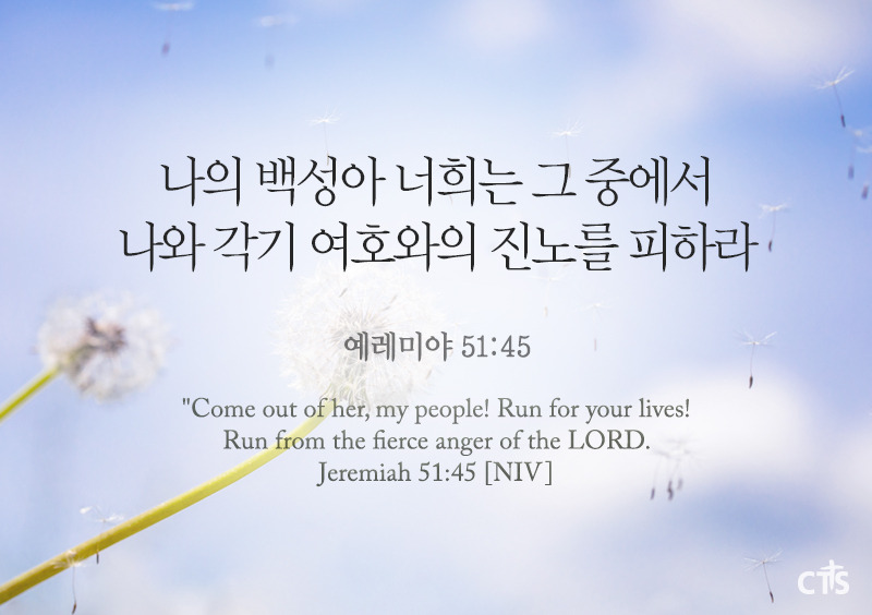 하나님은 이제 이스라엘 백성들에게 그런 나라로부터 나오라고 말씀하십니다. 45절에 보면, "나의 백성아 너희는 그 중에서 나와 각기 여호와의 진노를 피하라"고 말씀합니다. 이 말씀은 요한계시록 18장 3절의 말씀, "내 백성아 거기서 나와서 그의 죄에 참여하지 말고 그가 받을 재앙들을 받지 말라"는 이 말씀과 연결됩니다.